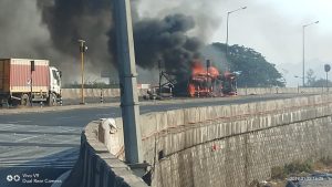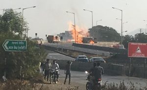 केशव भूमि नेटवर्क ,पालघर,22 जनवरी : मुंबई से सटे पालघर जिला के चारोटी में मुंबई – अहमदाबाद हाइवे पर हैड्रोजन गॅस सिलेंडर से भरे एक ट्रक में पलटने के बाद आग लगने से ट्रक समेत एक मैजिक रिक्शा जल कर खाक हो गई. वही इस घटना में ट्रक चालक अवत बिहारी की भी जलकर मौत हो गई .